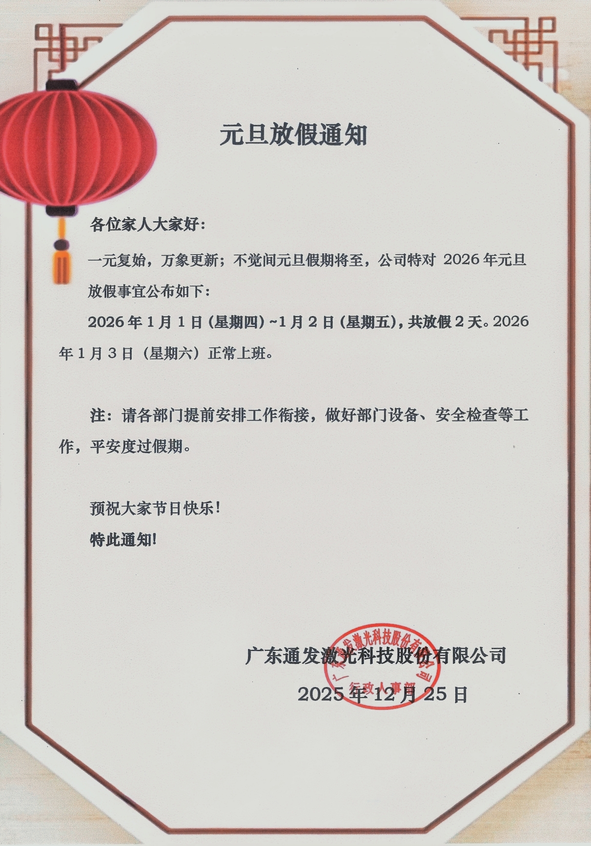 通發激光2026年元旦放假通知